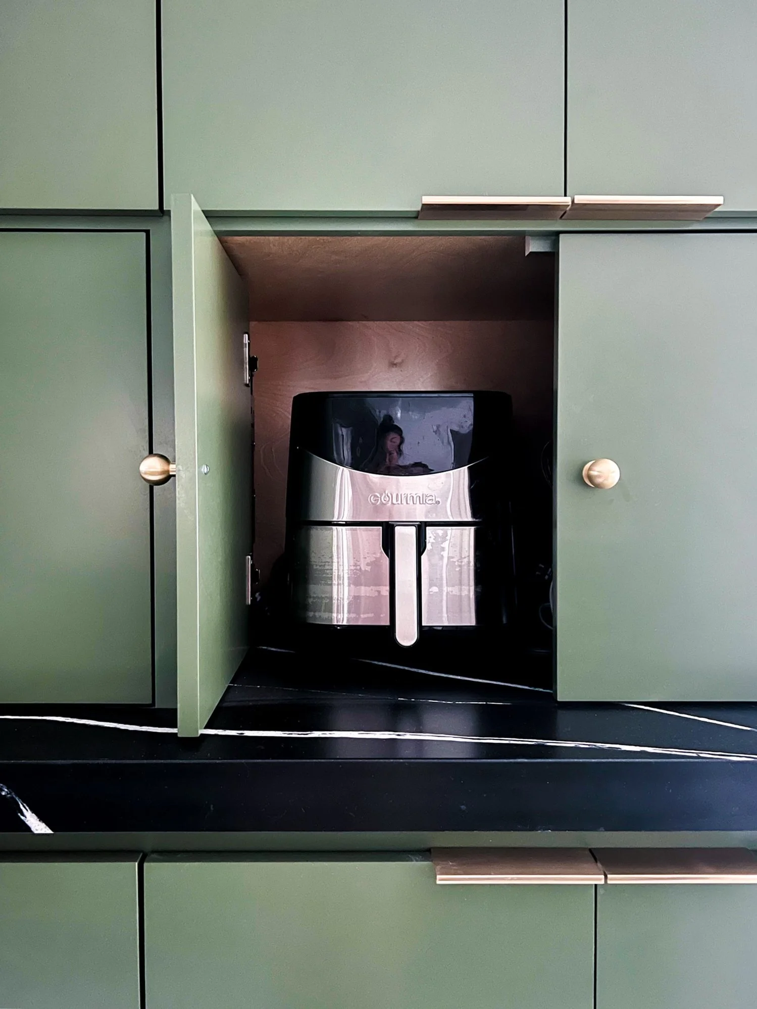 As a cooking enthusiast, I have tons of tools, gadgets, and devices that I ran out of space for in our previous kitchen. I’ve always wanted hidden pocket doors with outlets like this for frequented appliances like my Air Fryer that allow me to enjoy my toys without sacrificing my space.